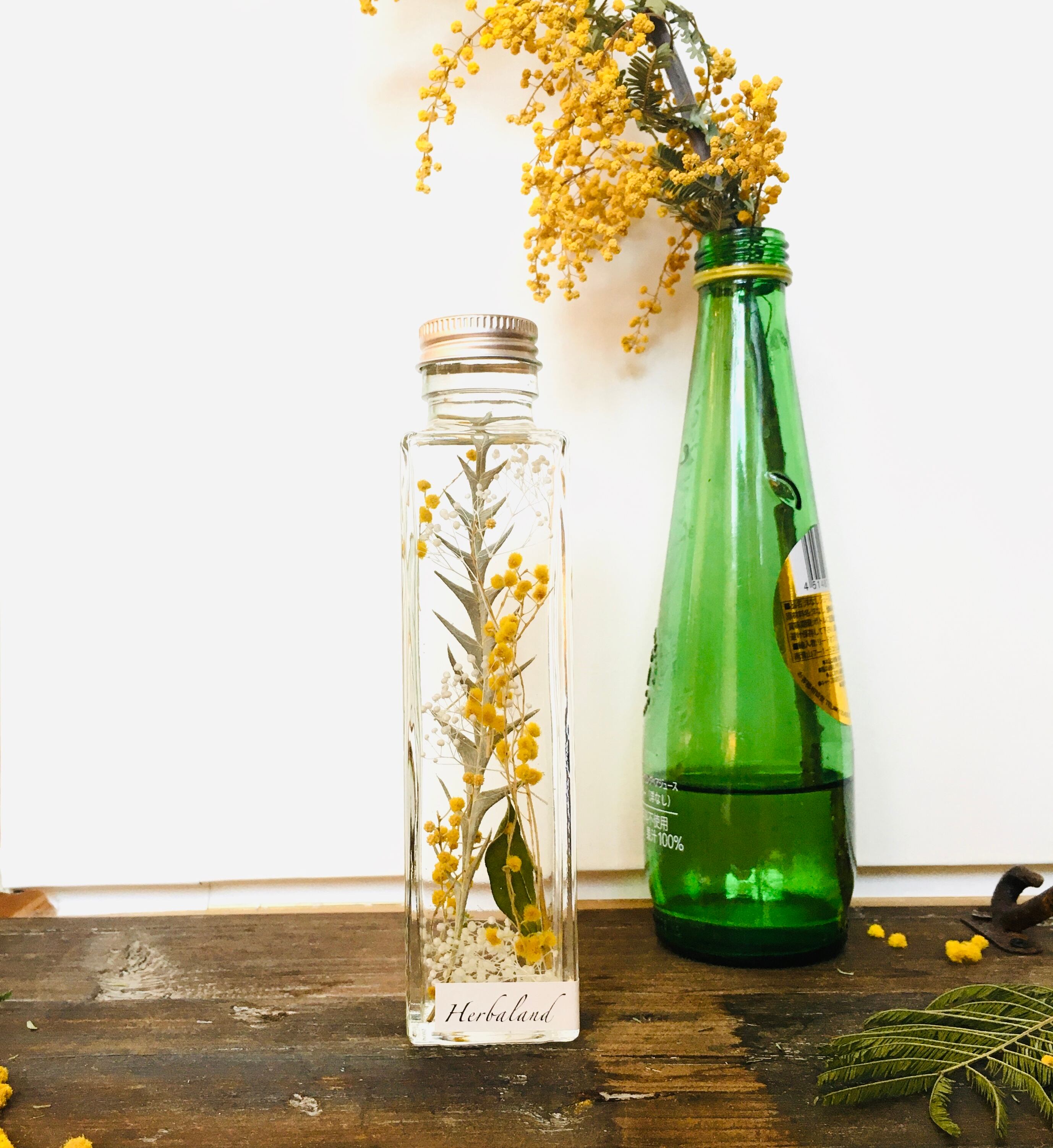 花材は、プリザーブドフラワーのミモザ、かすみ草、グレビレアなど。