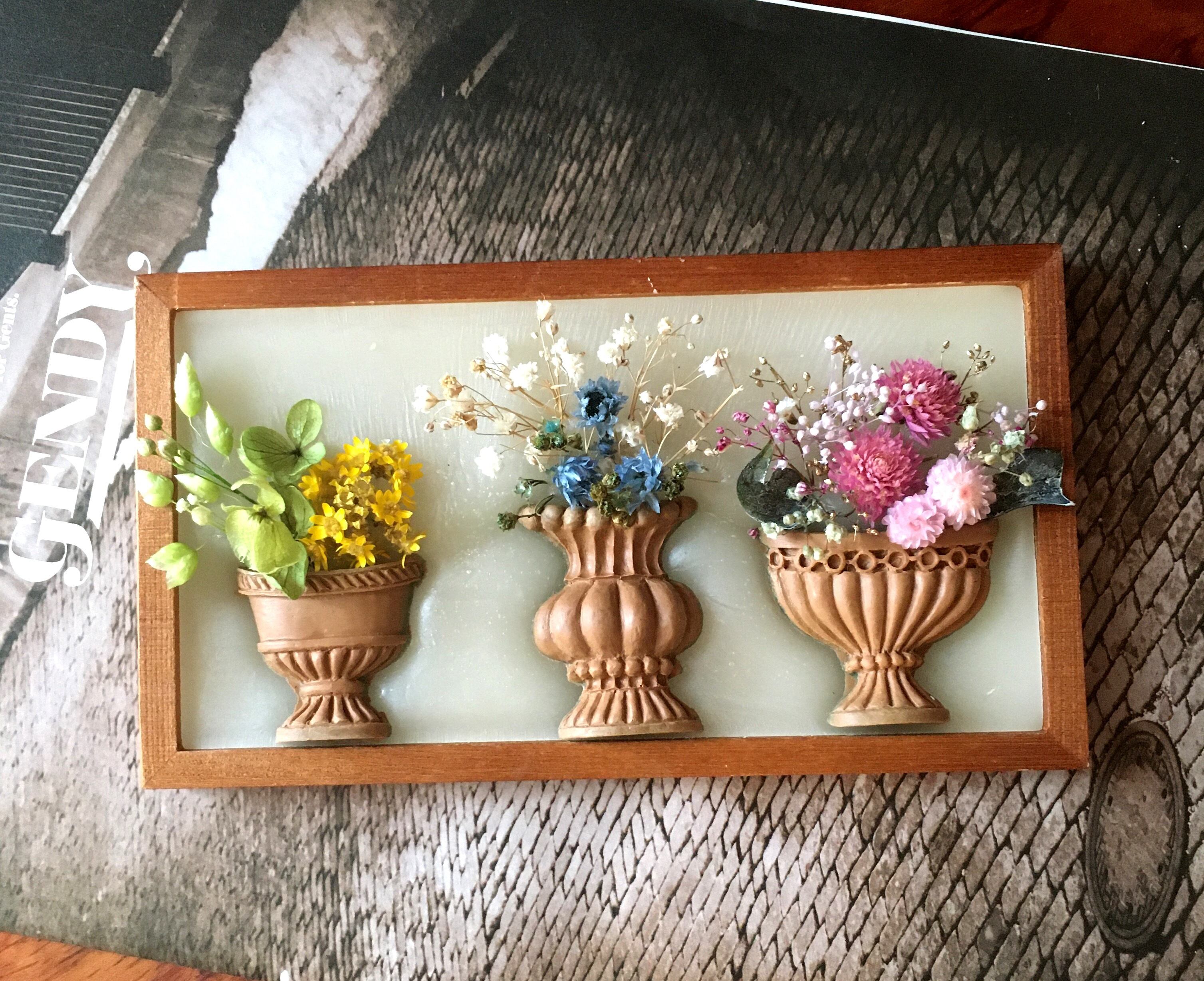 アロマワックスで作った花器、アロマワックスの背景。いつも以上にアロマの香りが楽しめるフレームアレンジです。