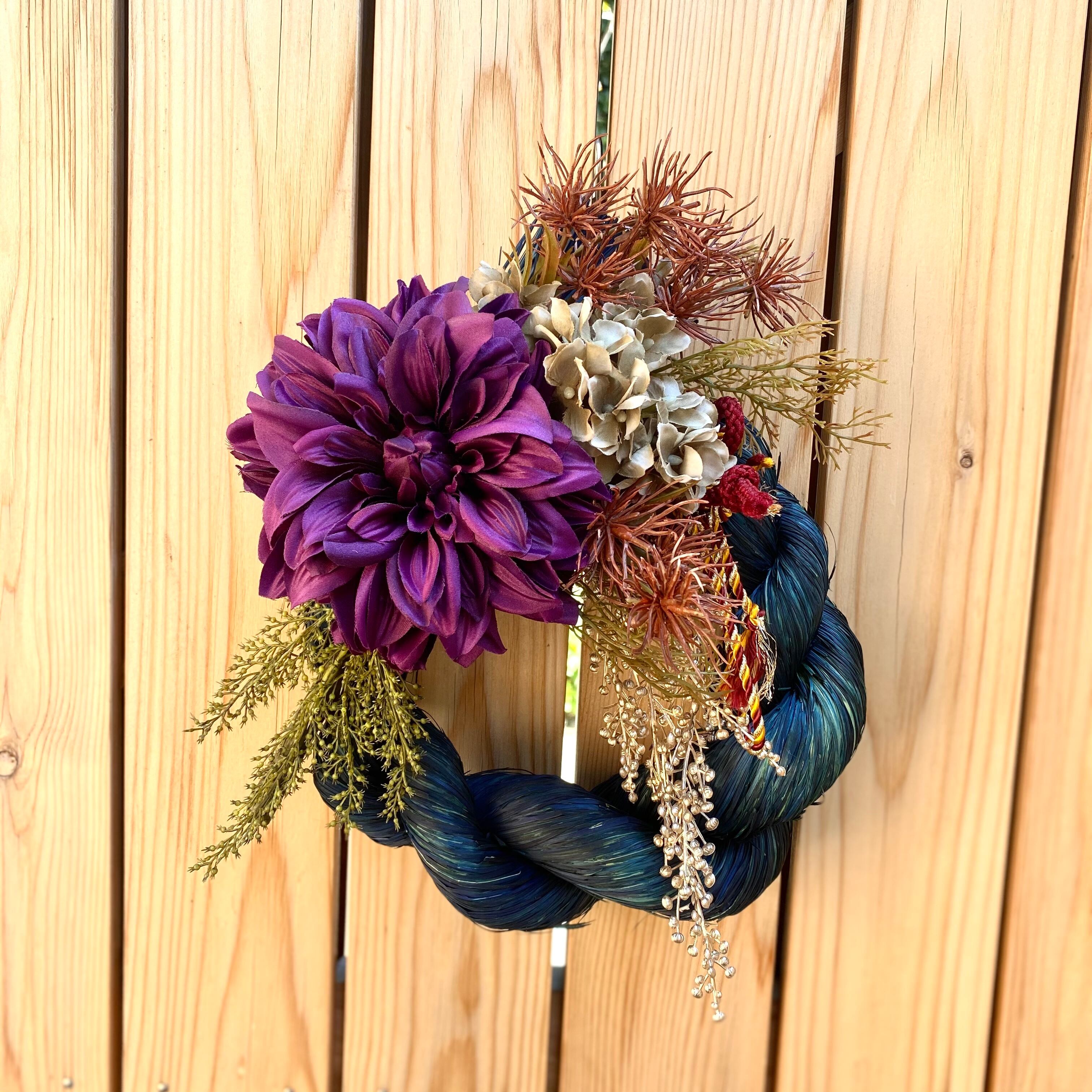 パープルの大きなダリアにシックなグレーの紫陽花、ゴールドを合わせ、水引を使わずコードリボンをつかいました。
