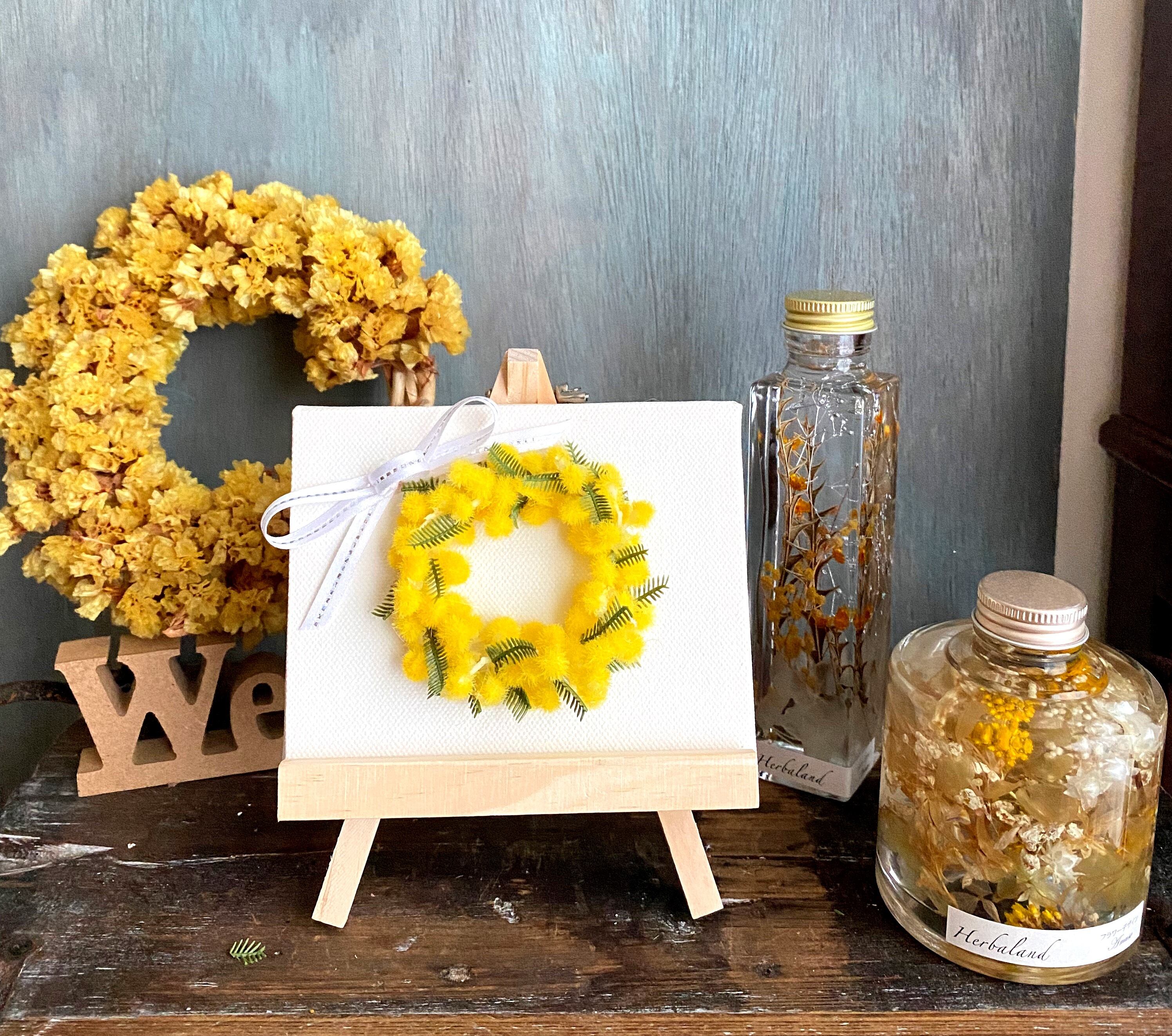 今回は、アーティフィシャルフラワーのミモザリースをキャンバスの上に作りました。