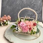 プリザーブドフラワーの薔薇、カーネーション、紫陽花、ライスフラワー、小花、ラッキーアイテムのペッパーベリー、さらにアーティフィシャルフラワー(高品質な造花)のベリー(実物)をプラスしました。