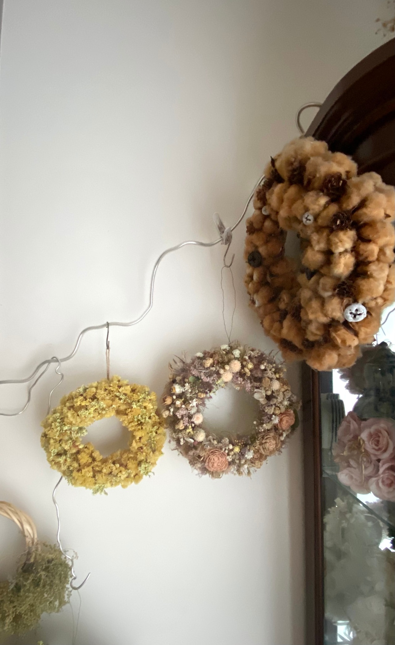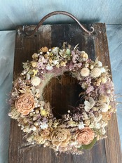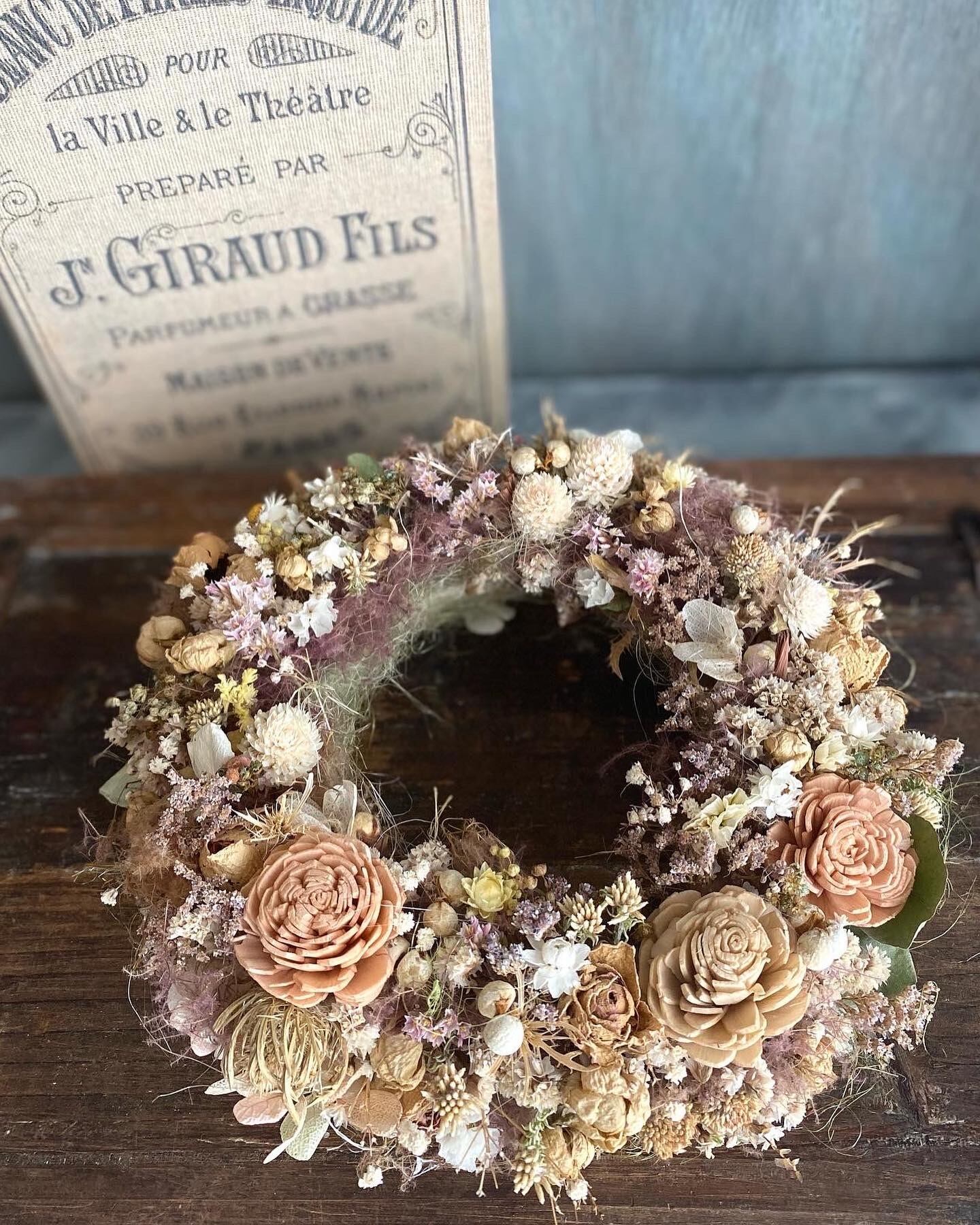 優しい色合いのドライフラワーばかりを使い、リースを作りました。