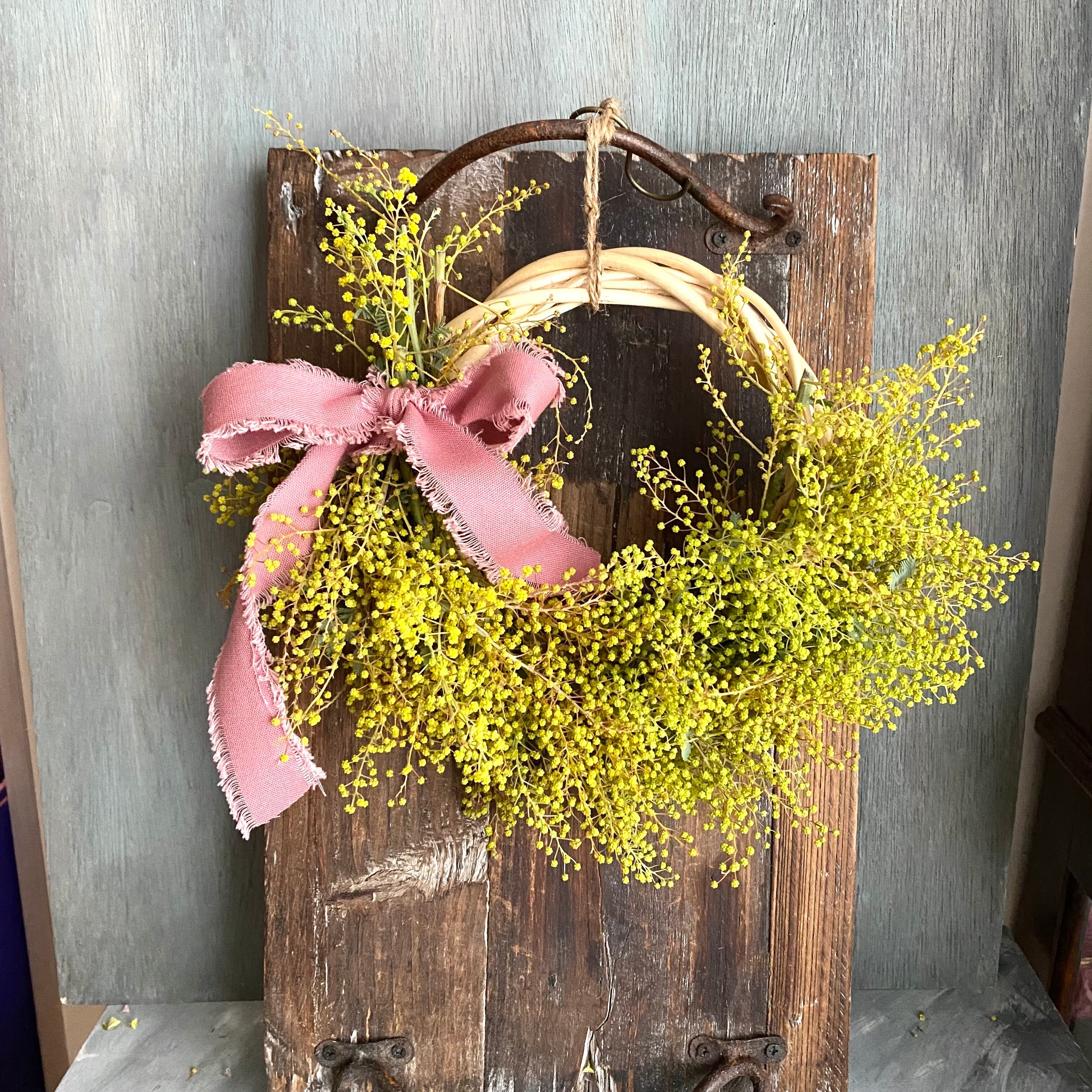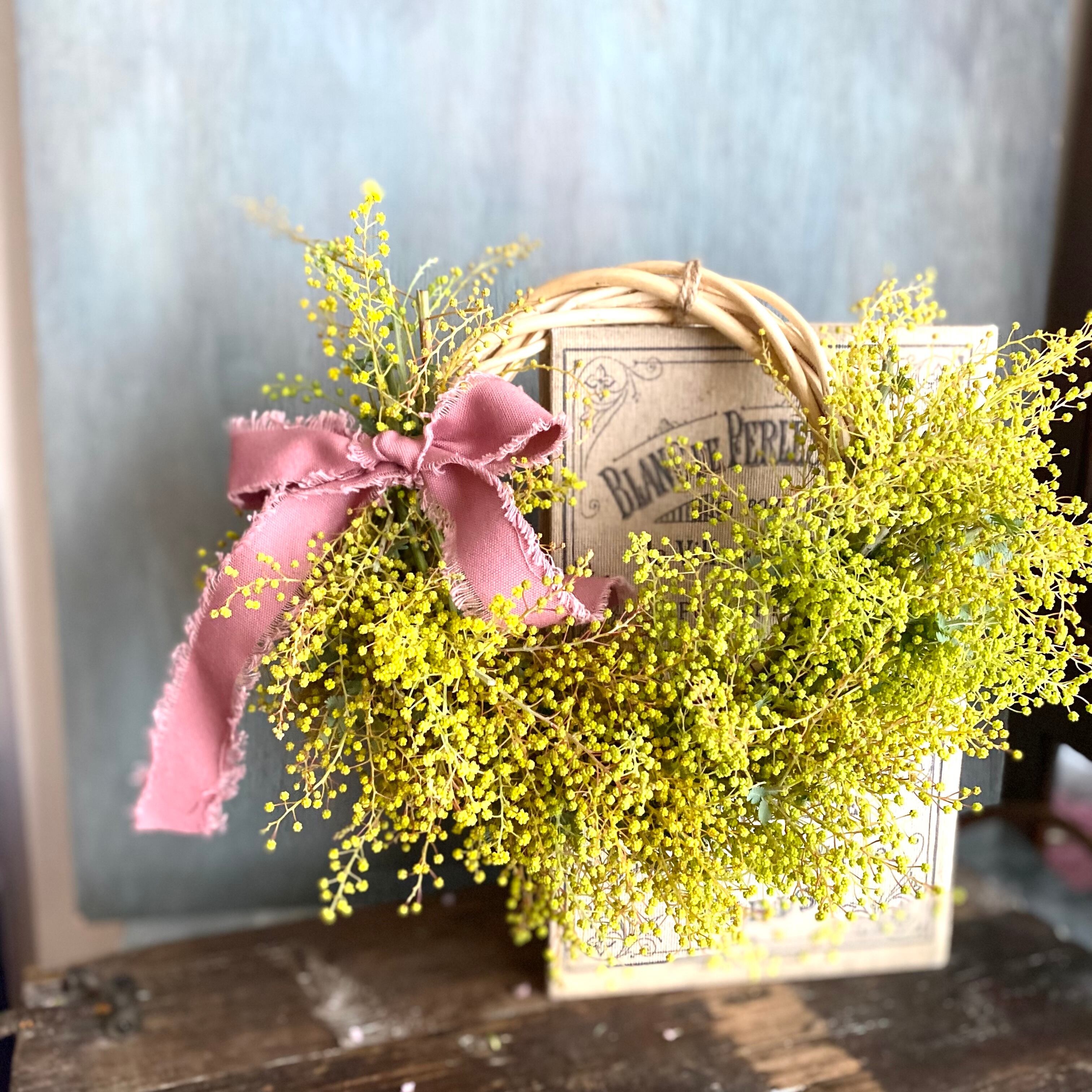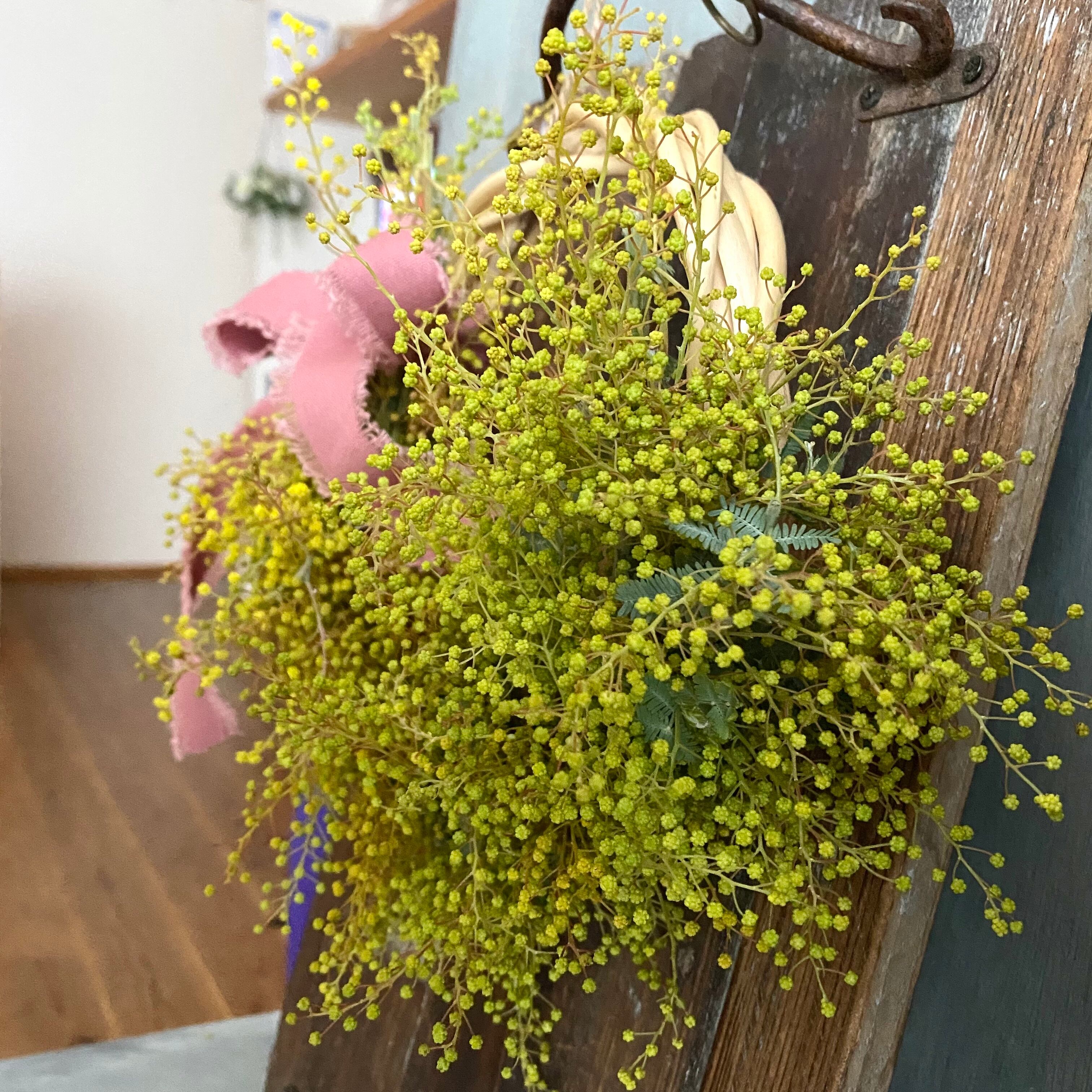 フレッシュミモザの葉を取り、ミモザだけで作りました