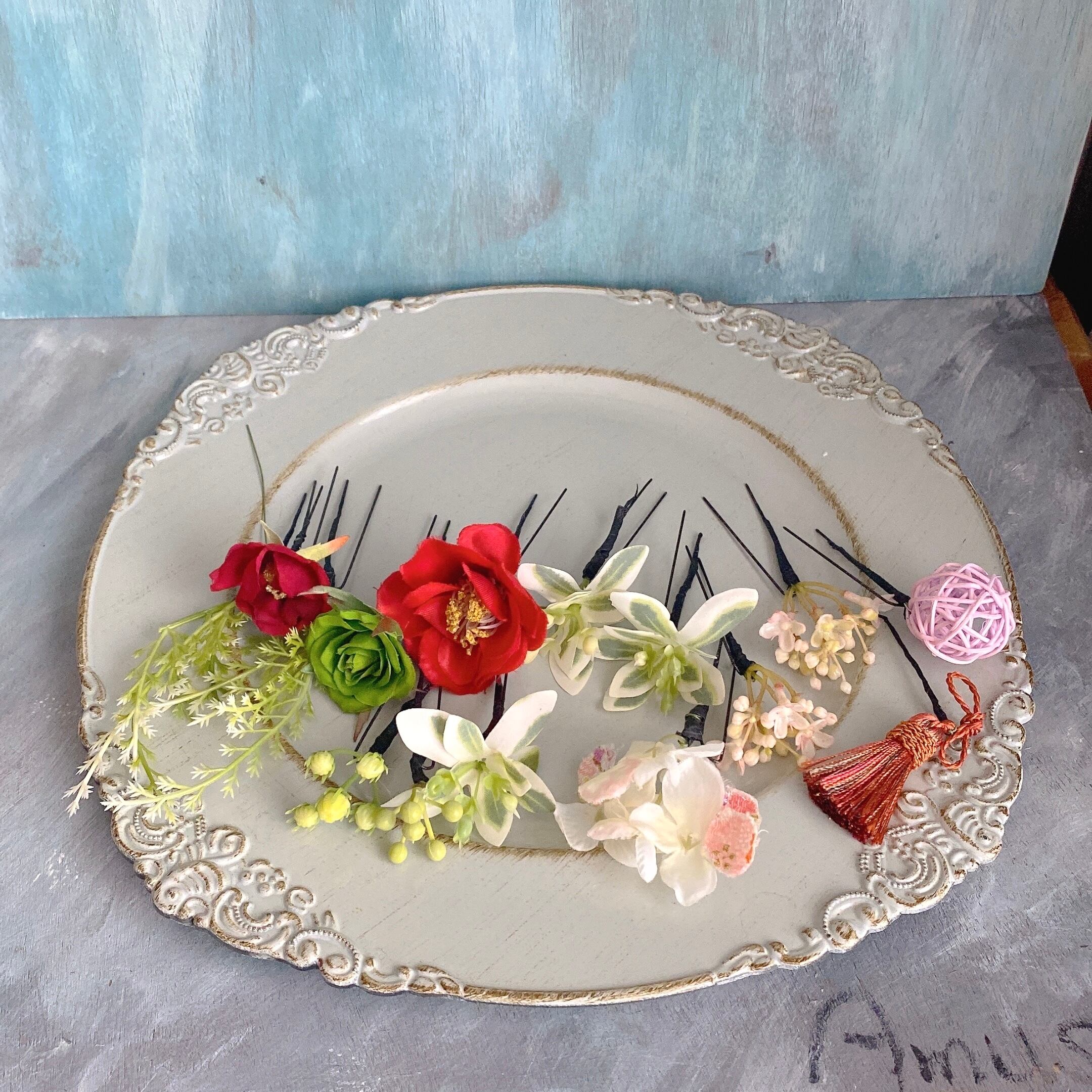 使用花材は、アーティフィシャルフラワーのバラと椿、ちりめん紫陽花、ユーフォルビア、実物、タッセル、ラタボール、グリーンリーフなどです