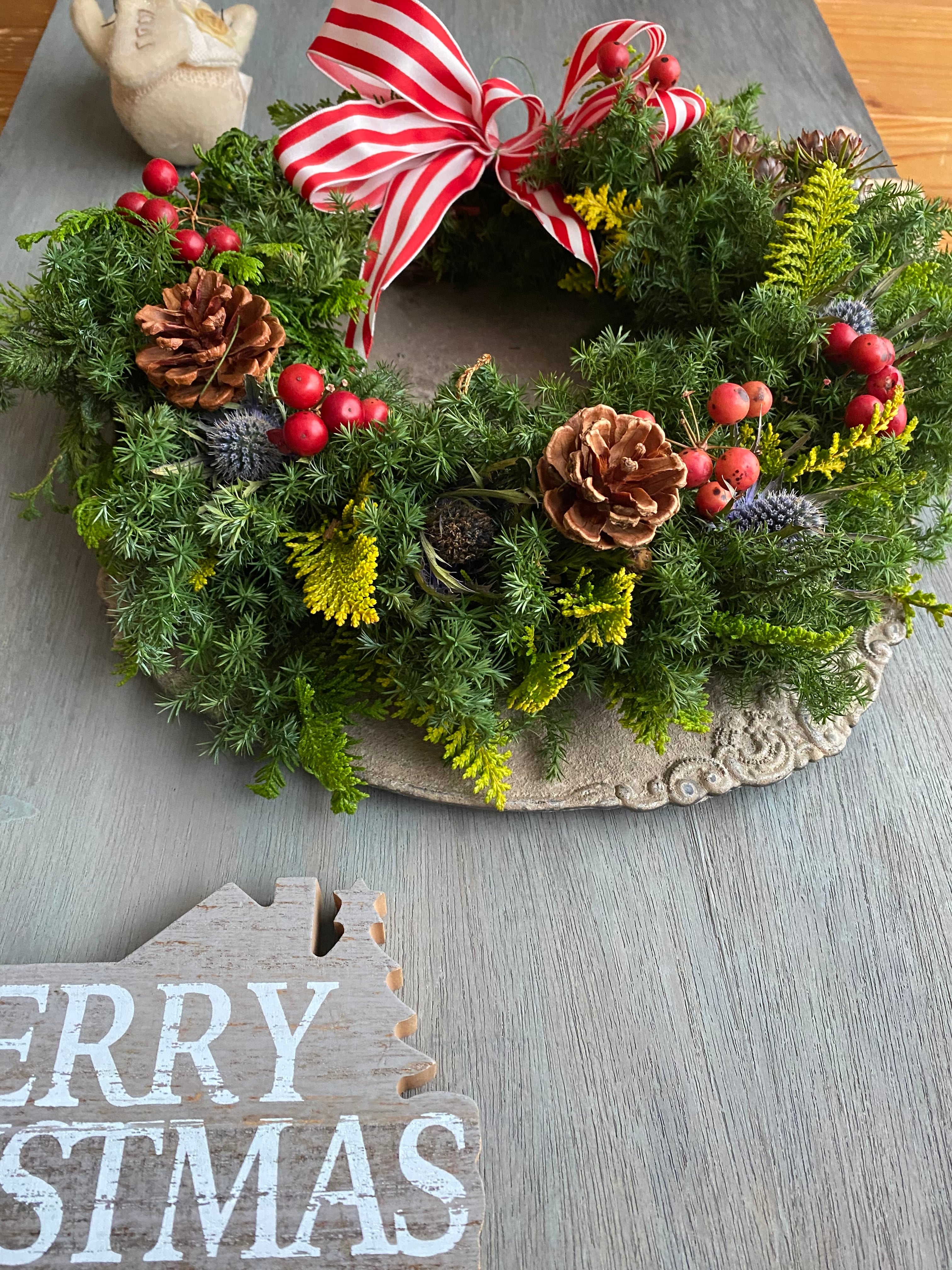 生花のさつますぎ、黄金ヒバを使いリースにした