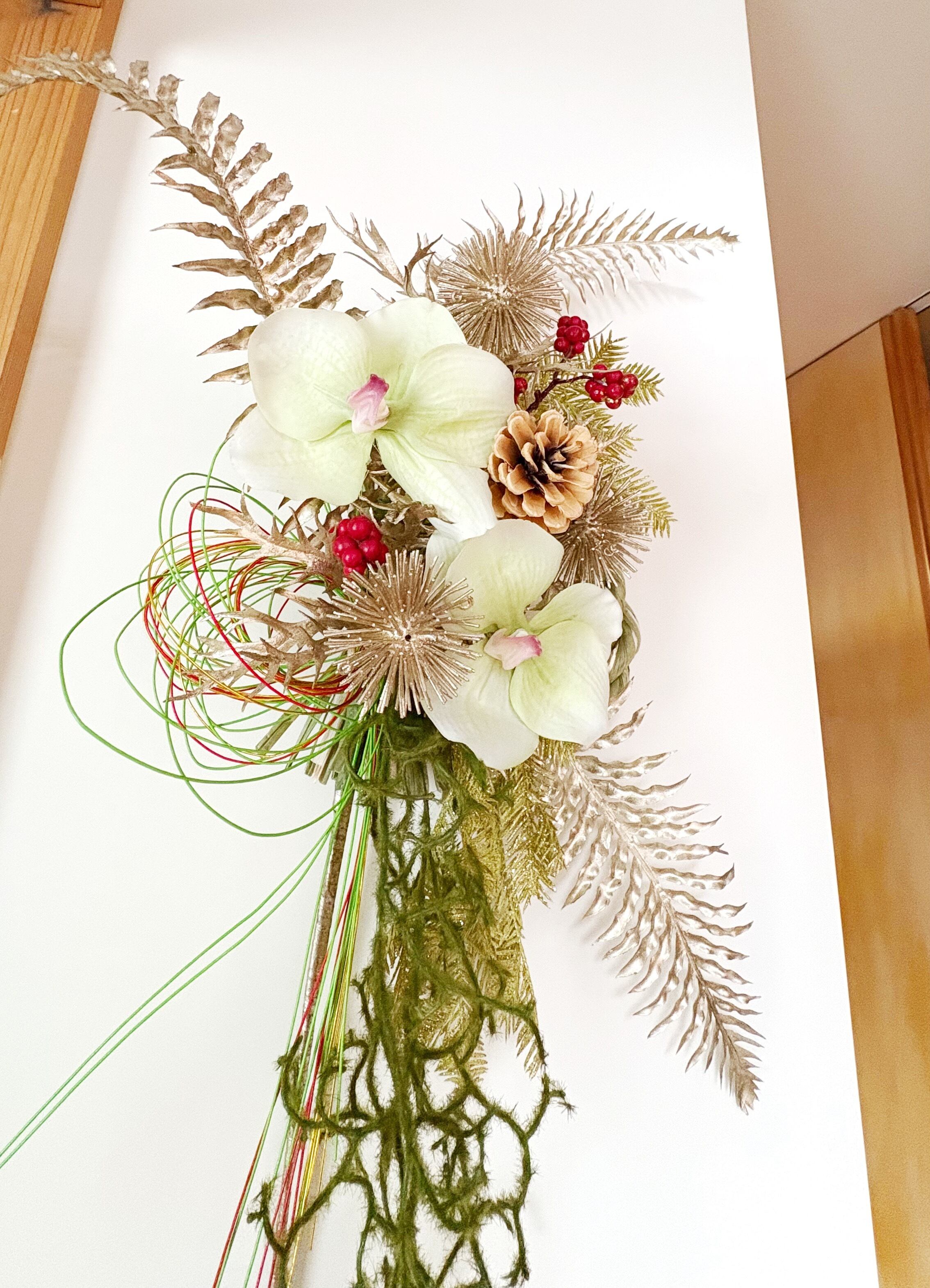 このしめ縄は、胡蝶蘭とプラチナゴールドとグリーンの鮮やかなコントラストが特徴です。シンプルながらもシュッとした姿が、飾る場所を選ばず、どんなインテリアにもマッチします。